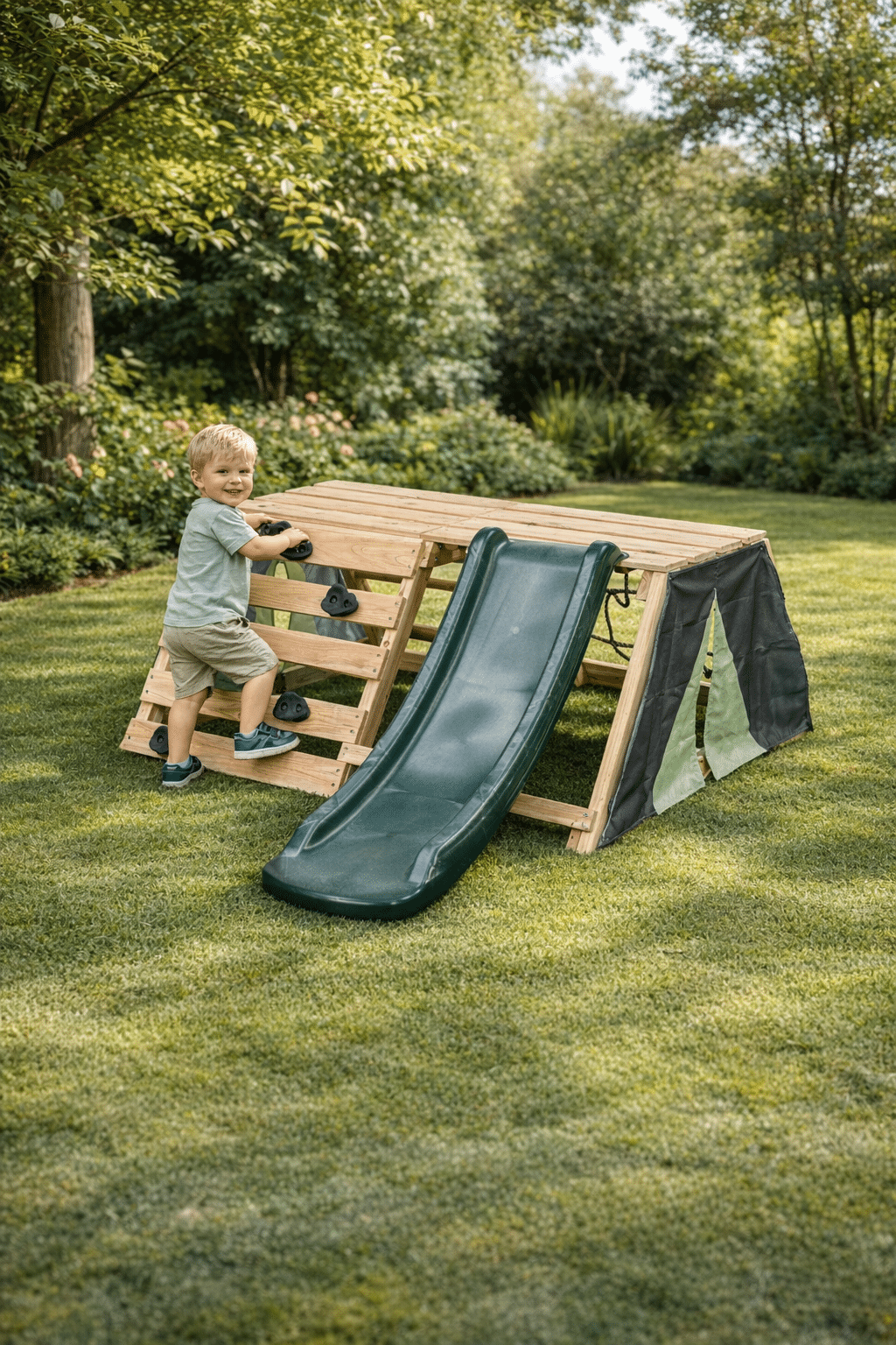 Speeltoestel Charlie biedt een uitdagende en speelse omgeving voor kinderen, direct in de tuin. Dit compacte klimtoestel is voorzien van een 1,2 meter lange glijbaan, klimstenen, een stevig klimnet en speelse doeken, waardoor kinderen eindeloos kunnen klimmen, glijden en ontdekken.